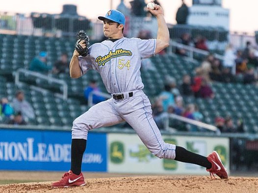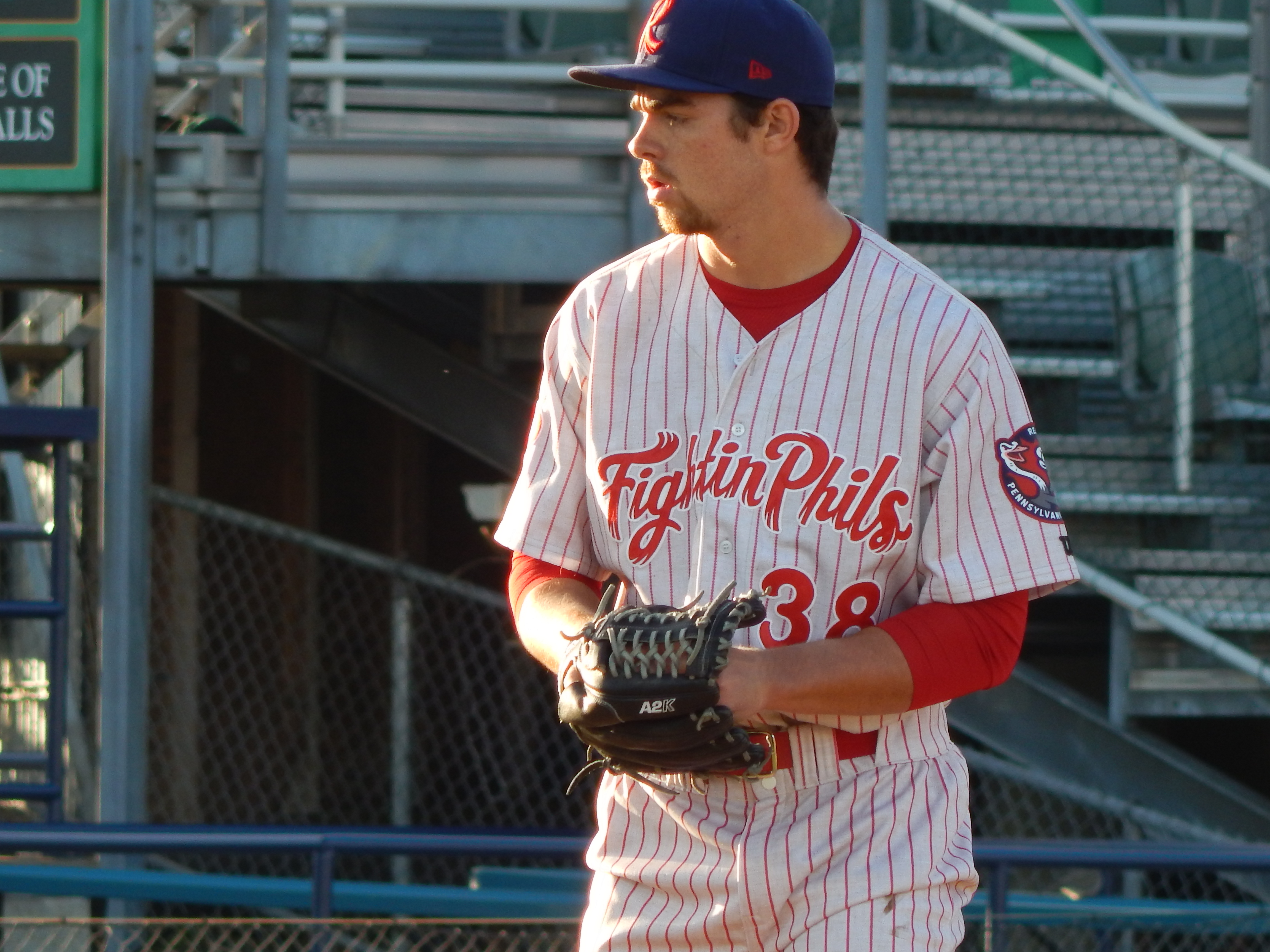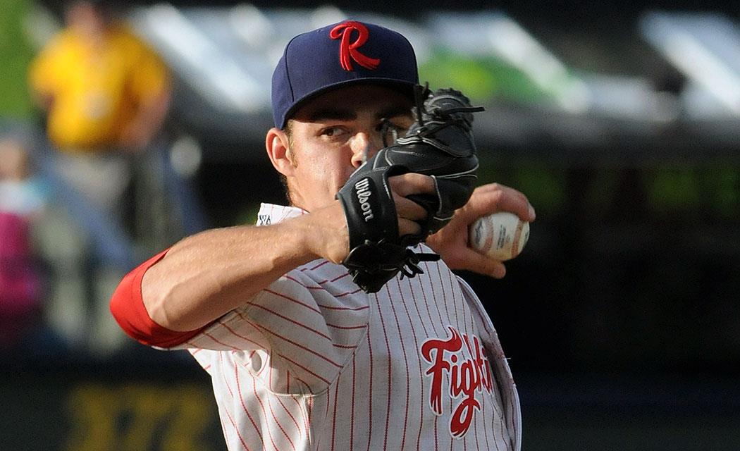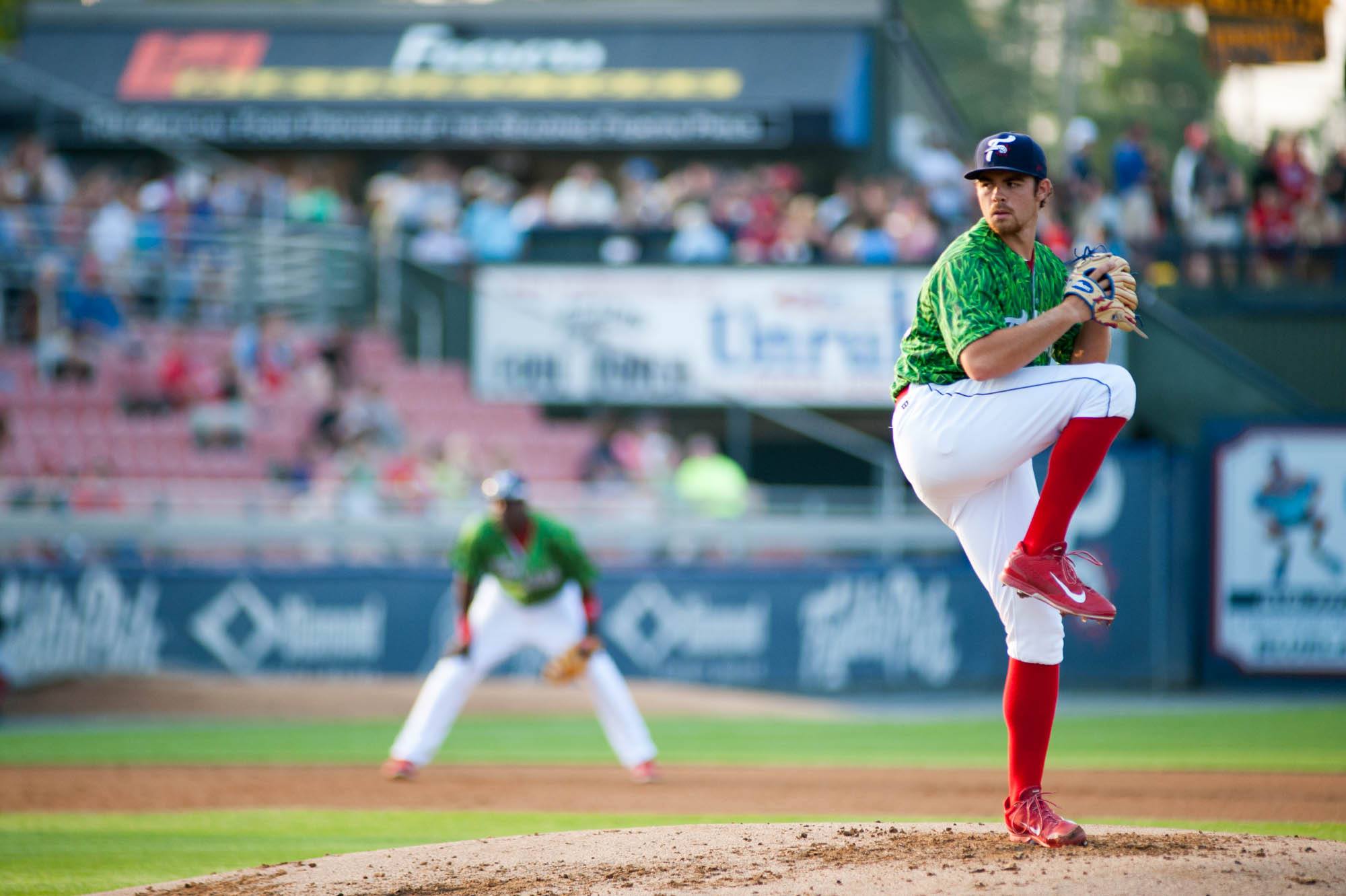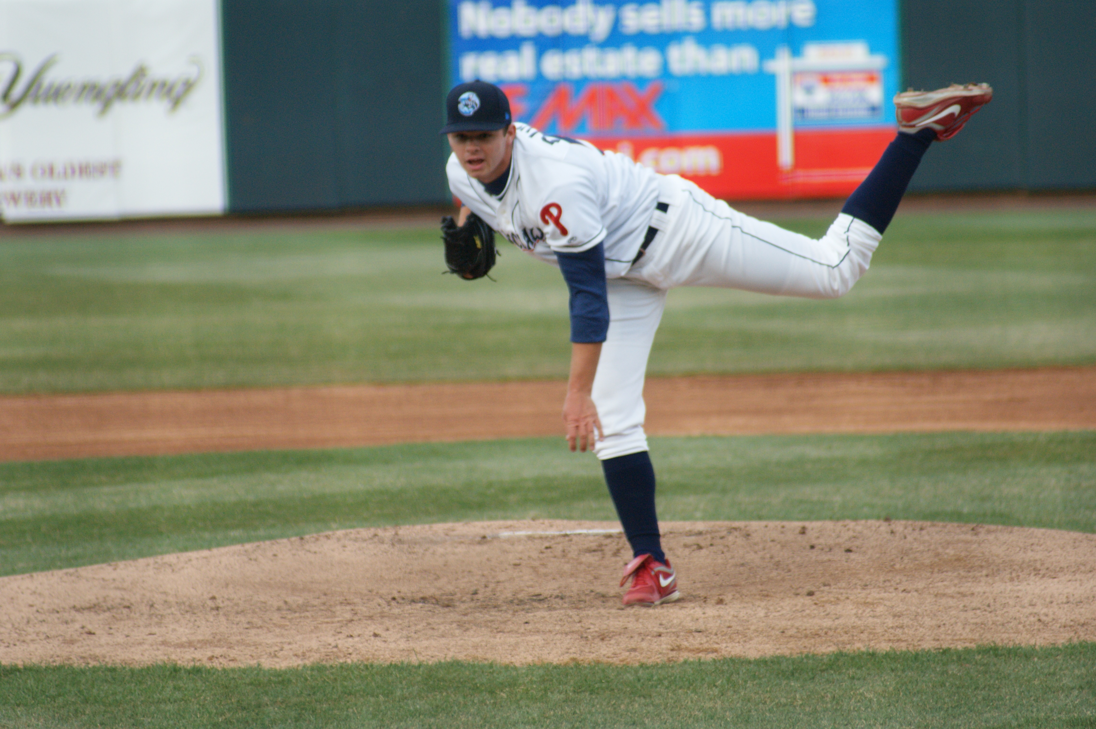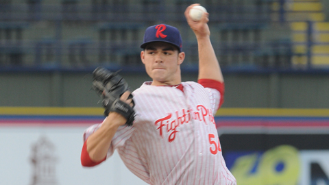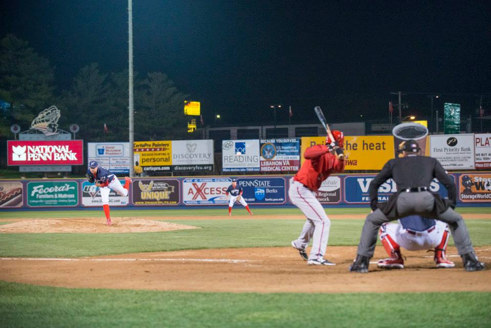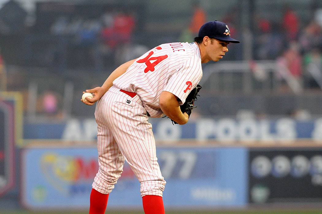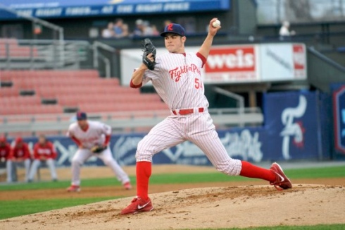 On the mound in April. (Source: Tug Haines/Reading Fightin Phils)